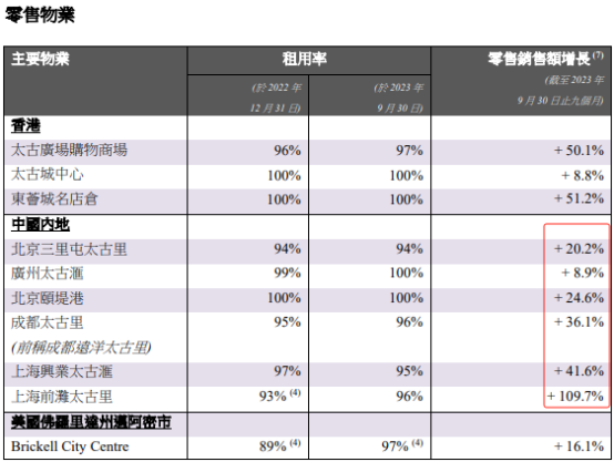 該等項目租用率基本都持平或比2022年底有所上升,零售銷售額方面,除了廣州太古匯錄得8.9%同比增長外,其余項目增幅均在20%以上,上海前灘太古里增幅更是達到109.7%。