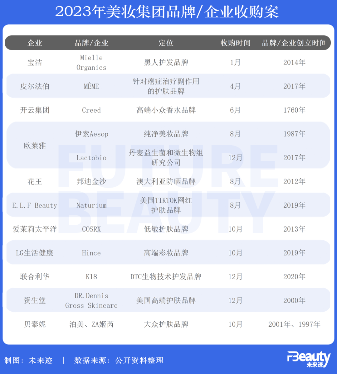 據(jù)《FBeauty未來跡》不完全統(tǒng)計,2023年發(fā)生在美妝公司的收購案共有12筆,這一領域也一直是像歐萊雅、寶潔、聯(lián)合利華之類大玩家的主場。
