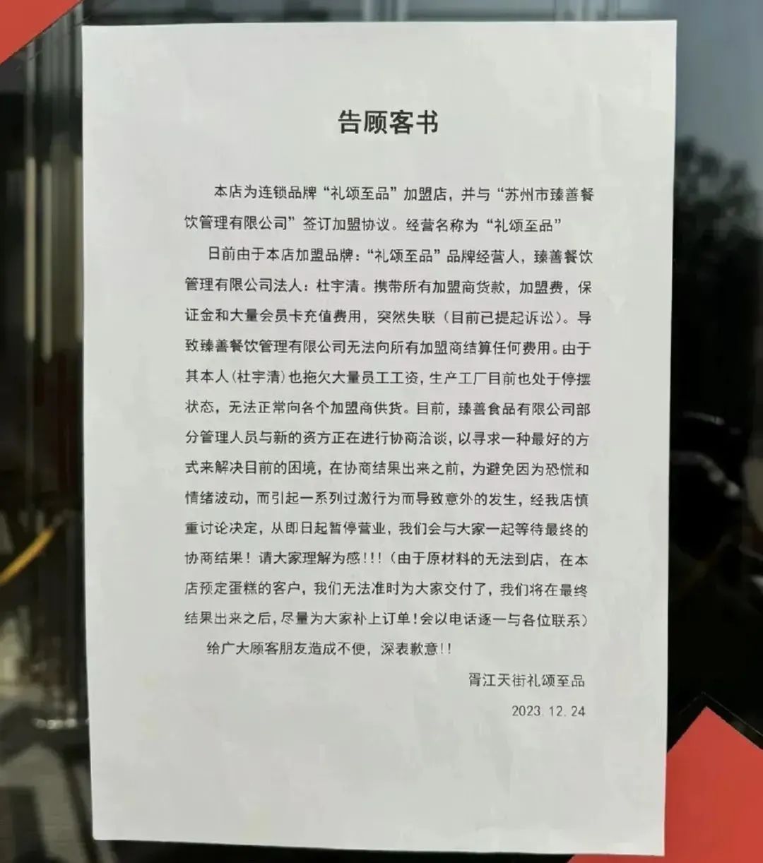 但是幾天后,12月24日,禮頌至品胥江天街店貼出的《告顧客書》還是透露出其經(jīng)營狀況出現(xiàn)問題。