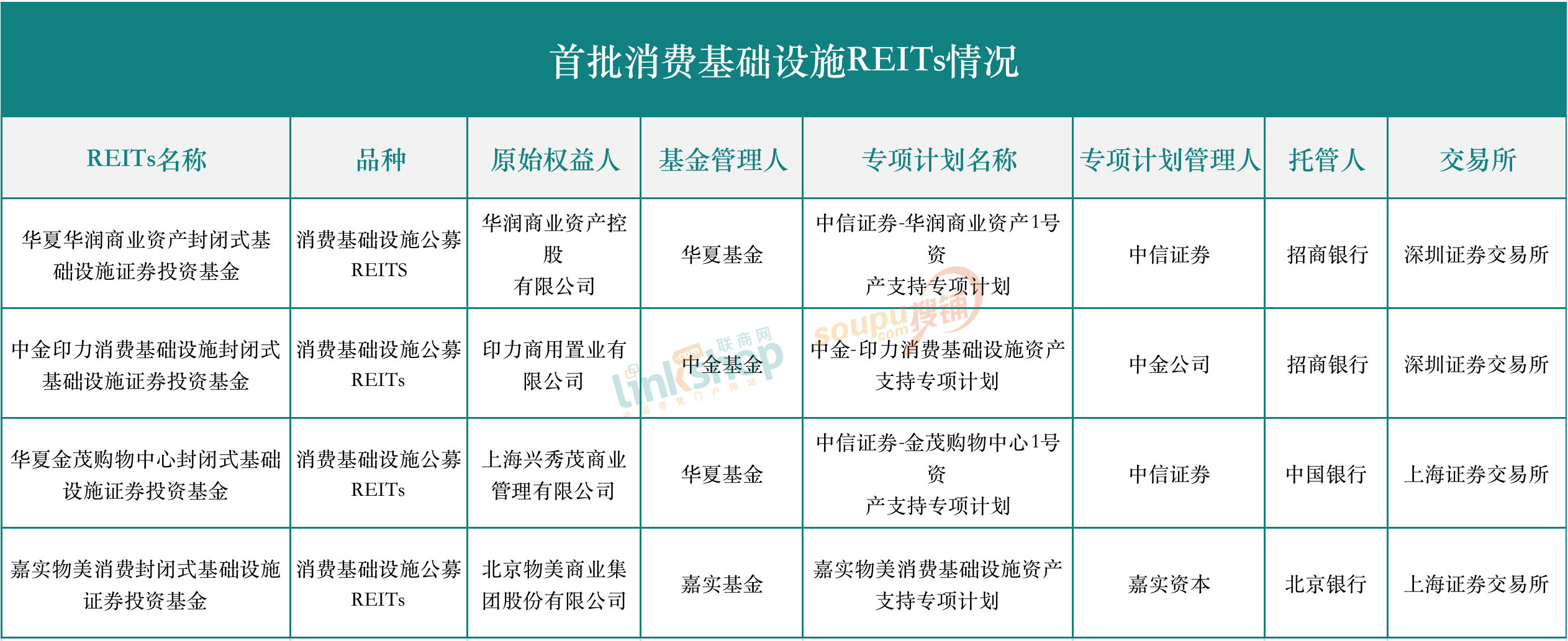 10月26日,證監(jiān)會(huì)及滬深交易所官網(wǎng)公開信息顯示,華夏基金、中金基金、嘉實(shí)基金分別上報(bào)了首批消費(fèi)基礎(chǔ)設(shè)施公募REITs,分別是華夏金茂購(gòu)物中心REIT、華夏華潤(rùn)商業(yè)資產(chǎn)REIT、中金印力消費(fèi)REIT、嘉實(shí)物美消費(fèi)REIT。四個(gè)原始權(quán)益人分別是華潤(rùn)置地、印力集團(tuán)、金茂商業(yè)和物美商業(yè)集團(tuán)。