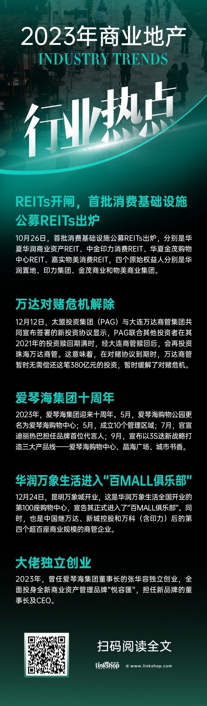 也許上半年都在忙著提振消費(fèi)促?gòu)?fù)蘇,行業(yè)的熱搜事件發(fā)生了下半年的年末階段。一件是10月份首批消費(fèi)基礎(chǔ)設(shè)施REITs誕生,另一件是萬達(dá)的“百億對(duì)賭”危機(jī)暫時(shí)解除。