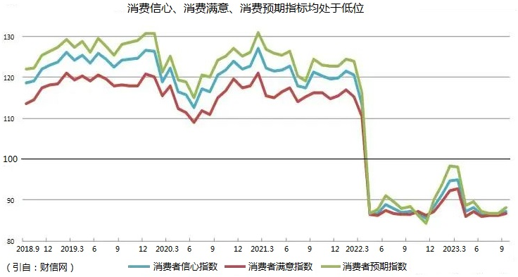 根據(jù)財(cái)信網(wǎng)10月份發(fā)布數(shù)據(jù),全國消費(fèi)者信心調(diào)查結(jié)果顯示,2023年9月,消費(fèi)者信心指數(shù)87.20點(diǎn),環(huán)比上行0.70點(diǎn);消費(fèi)者滿意指數(shù)86.60點(diǎn),環(huán)比上行0.30點(diǎn),消費(fèi)者預(yù)期指數(shù)88.10點(diǎn),環(huán)比上行1.30點(diǎn)。與2021年疫情期間比較,2022年以來三項(xiàng)指標(biāo)均大幅下降,處于100以下的低位水平,在2023年一季度有初步反彈,但是五一以后又下降到90以下的沉寂水平,顯示出大眾消費(fèi)活力非常低。