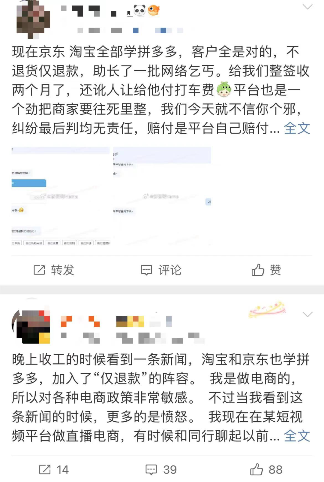 比如在淘寶平臺,已經(jīng)有商家在社交平臺吐槽僅退款策略,表示要換個平臺。還有商家表示,商家也是消費者,對推廣效果不滿意能不能讓淘寶把推廣費僅退款一下。商家們的不滿和疑惑,必然有一定道理。