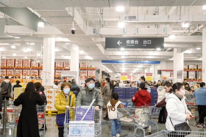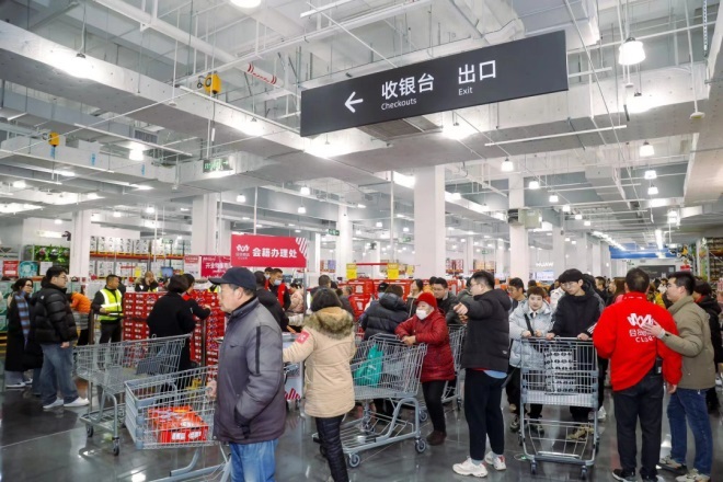 雖是寒冷冬日,常州M會員商店內(nèi)卻火爆異常,上午十點左右,收銀臺就已排滿了買單的長隊。