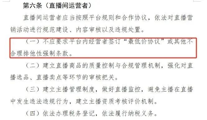 2023年12月,上海市市場(chǎng)監(jiān)督管理局新修訂的《上海市網(wǎng)絡(luò)直播營(yíng)銷活動(dòng)合規(guī)指引》第六條(一)明確指出:不應(yīng)要求平臺(tái)內(nèi)經(jīng)營(yíng)者簽訂“最低價(jià)協(xié)議”或其他不合理排他性強(qiáng)制條款。