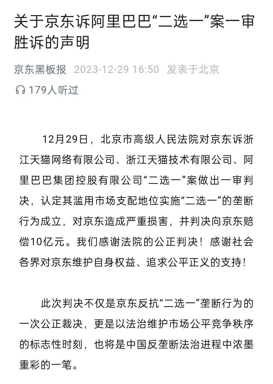 2023年12月,北京市高級(jí)人民法院對(duì)京東訴阿里“二選一”案作出一審判決,認(rèn)定阿里濫用市場(chǎng)支配地位實(shí)施“二選一”的壟斷行為成立,對(duì)京東造成嚴(yán)重?fù)p害,并判決向京東賠償10億元。