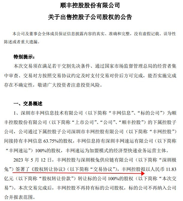5月12日,極兔速遞官宣下屬子公司深圳極兔供應(yīng)鏈有限公司擬以人民幣11.83億元的價(jià)格收購豐網(wǎng)控股全資子公司深圳豐網(wǎng)信息技術(shù)有限公司(以下簡稱“豐網(wǎng)信息”)100%股權(quán)。
