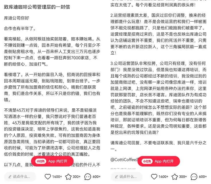 12月24日,內(nèi)參君在小紅書上看到了這樣一則內(nèi)容:《致庫迪咖啡公司管理層的一封信》,發(fā)帖人自稱是庫迪咖啡的聯(lián)營商,Ta寫到: