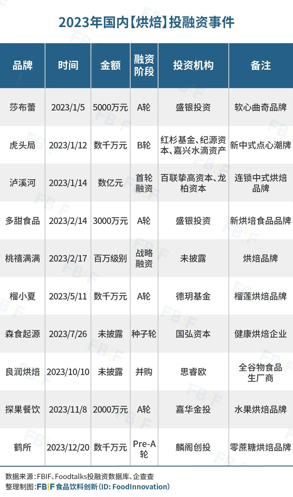 2023年,烘焙行業(yè)共發(fā)生10起投融資事件,去年該數(shù)字為15起。從融資輪次上來看,10起投融資事件多集中在A輪和B輪上,如鶴所、探果餐飲、榴小下、多甜食品和莎布蕾拿到了A輪階段融資。今年1月,新中式點心潮牌虎頭局拿到了紅杉基金、紀(jì)源資本、嘉興水滴資本數(shù)千萬元的B輪融資。