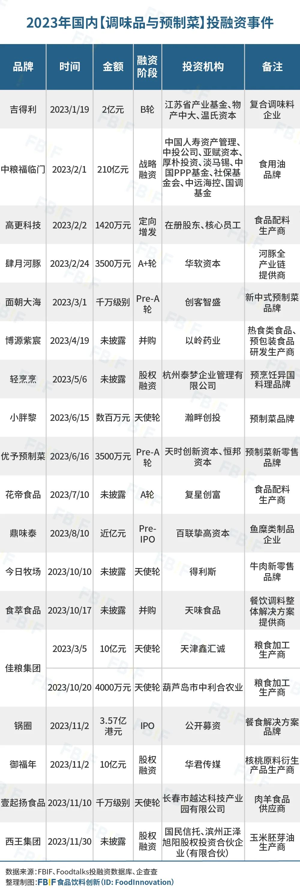 2023年,調(diào)味品與預(yù)制菜品類上共發(fā)生了19起融資事件,與去年21起相比略有回落。在19起融資事件中,預(yù)制菜品類融資有10起,調(diào)味品品類融資9起。