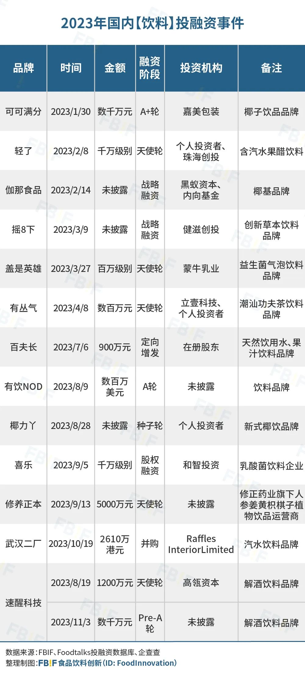 2023年,國內(nèi)飲料賽道共發(fā)生14起投融資事件,與去年持平。在已披露的數(shù)據(jù)中,最大額為修正藥業(yè)旗下人參姜黃枳棋子植物飲料品牌“修養(yǎng)正本“獲得5000萬元天使輪融資。另外,武漢二廠以并購的形式“曲線上市”也頗受關(guān)注。