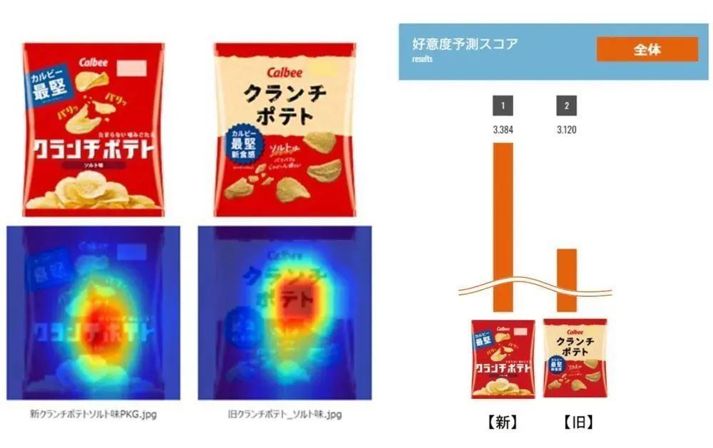 而PLUG AI的厲害之處,還在于它可以用熱成像、統(tǒng)計學(xué)上的離散程度分析等技術(shù)提前預(yù)判眾多款式的設(shè)計中哪一款受歡迎程度最高,降低試錯成本?恐@一技術(shù),PLUG AI曾經(jīng)幫日本零食品牌Calbee的新品Crunch Potato調(diào)整出了新包裝,產(chǎn)品銷量增長135%。