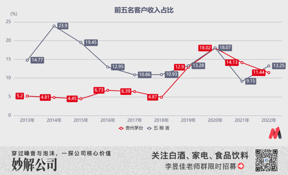五糧液效仿茅臺(tái)推行小商制,改革在2019年就已基本完成,對比其與茅臺(tái)的前五名經(jīng)銷商營收占比,2020年二者均為18%,2021年五糧液為9.15%,茅臺(tái)為14.13%;2022年五糧液比茅臺(tái)高1.81個(gè)百分點(diǎn)。