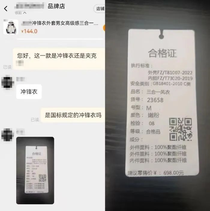 有消費者反映稱,在電商平臺購買的標題為“沖鋒衣”字樣的產(chǎn)品,購買時詢問客服確認為沖鋒衣,但實際收到貨后,產(chǎn)品顯示的執(zhí)行標準為夾克服裝所對應(yīng)的執(zhí)行標準;也有消費者購在收到貨后找商家對質(zhì),客服卻表示該產(chǎn)品“不是沖鋒衣,而是沖鋒衣的版型。”