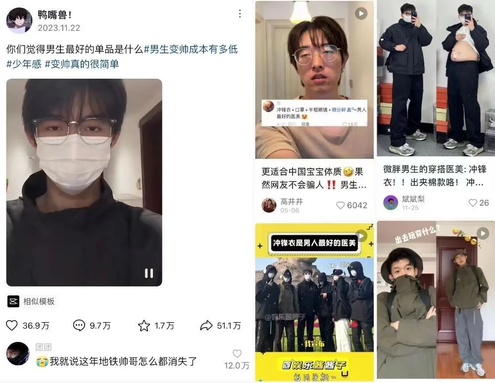 用戶的爭相模仿、自發(fā)傳播,讓“沖鋒衣穿搭”就這樣乘著“東風”,流傳到更廣泛的大眾圈層。
