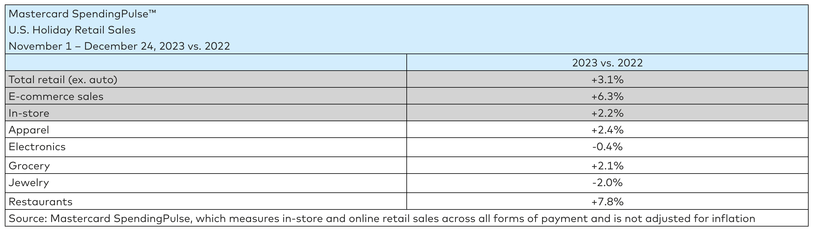 12月26日消息,國(guó)際金融服務(wù)公司Mastercard發(fā)布的一份報(bào)告顯示,11月1日至12月24日期間,消費(fèi)者盯住圣誕季的大型促銷活動(dòng),促使美國(guó)零售額增長(zhǎng)了3.1%,低于3.7%的增長(zhǎng)預(yù)期。報(bào)告顯示,由于在線購(gòu)物的受歡迎程度脫離了疫情期間的高點(diǎn),電子商務(wù)銷售額的增長(zhǎng)速度較去年的10.6%放緩至6.3%。節(jié)日購(gòu)物期間,服裝、超市和餐飲類別的銷售額分別增長(zhǎng)2.4%、2.1%和7.8%,而電子產(chǎn)品和珠寶銷售額分別下降0.4%和2%。