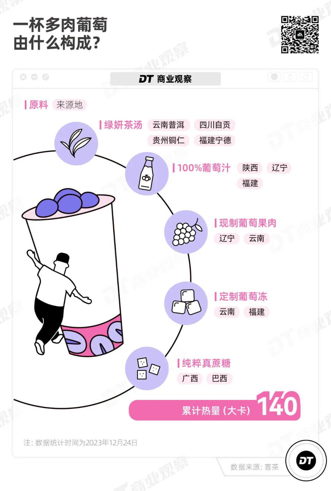 根據(jù)《喜茶2023年度報告》公開數(shù)據(jù),今年喜茶“年度飲品”(最受消費(fèi)者喜愛的飲品)的8款入選飲品中,有一半都是鮮果茶,分別是:多肉葡萄家族、酷黑莓桑、一大桶黃金桃和東坡荔枝飲。