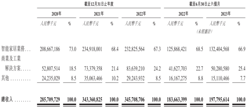 從營收構(gòu)成上看,智能家居業(yè)務(wù)仍是美的集團核心收入來源。數(shù)據(jù)顯示,2020年-2022年,美的智能家居業(yè)務(wù)實現(xiàn)營收分別為2086.67億元、2349.18億元、2328.26億元,收入占比分別為73%、68.4%和67.3%。