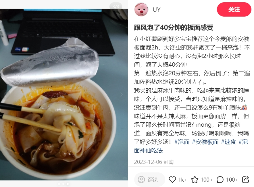 今麥郎安徽板面產(chǎn)品有多火呢?從小紅書上,“今麥郎板面竟然要這樣泡”“跟風泡了40分鐘的板面感受”“學小紅書泡了兩個小時的板面”等頻頻成為博主筆記標題中就可以略知一二。
