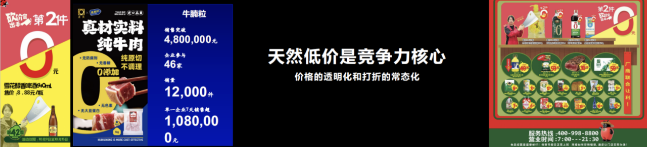 我們牛肉為什么能賣這么好?因為跟正大合作真的便宜,99塊錢兩公斤,一個星期就賣了120 萬,所以只有便宜才重要,但大家也記住,如果便宜都是自己砍自己就沒有意思了,要利用商業(yè)聯(lián)盟的力量,要利用渠道的力量,要利用合作的力量獲得更低的價格。現(xiàn)在這些第二件0元的產(chǎn)品反而是我們利潤最高的。