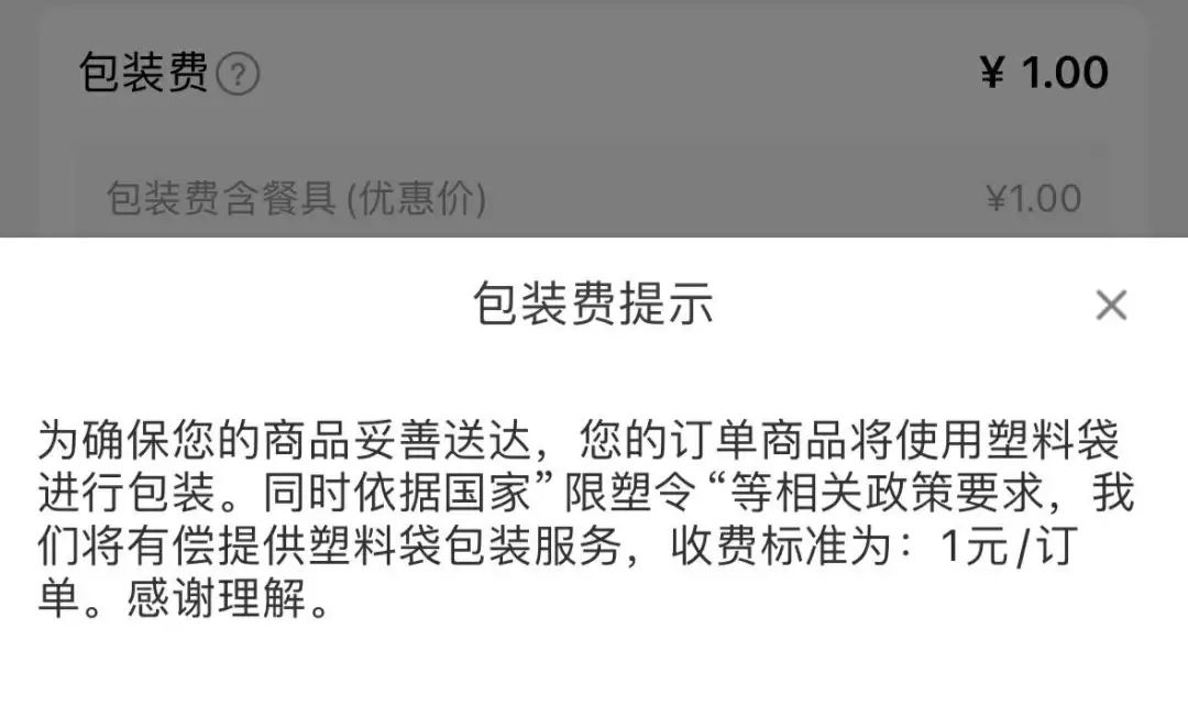 1月1日,有消費者發(fā)現(xiàn)盒馬線上訂單開始收取包裝費,由頭是響應限塑令。本來也是比較常見的事情,直到仔細研讀了收費標準——1份訂單1元,按單收費也就是說無論你有沒有用到包裝袋,這1元都必須掏了。