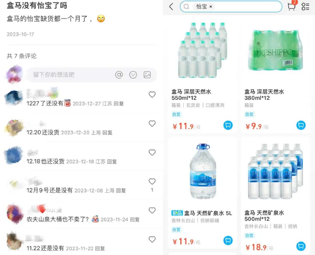 原因是消費者發(fā)現(xiàn):你在盒馬(非云超)里喝不到農(nóng)夫山泉和怡寶的礦泉水了。“只剩下自營品牌的礦泉水了,這大抵就是人間正道是自營。”