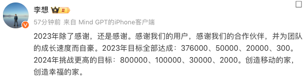李想也在其微博中表示:“2023年目標全部達成:376000、50000、20000、300。2024年挑戰(zhàn)更高的目標:800000、100000、30000、2000”。也就是說,2024年理想汽車全年交付量目標為80萬輛。