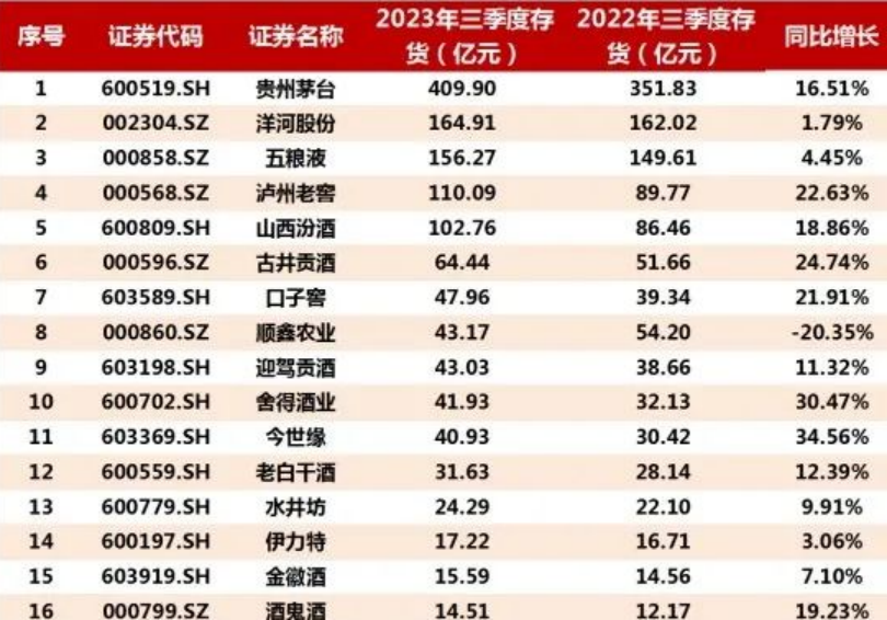 如白酒行業(yè),去年前三季度國內20家上市白酒企業(yè)庫存較同期增長12.64%至1363.55億元,創(chuàng)下歷史新高。貴州茅臺、洋河股份、五糧液、瀘州老窖、山西汾酒等5家酒企存貨均超百億元。茅臺存貨更是高達409億元,為20家上市酒企中最高。