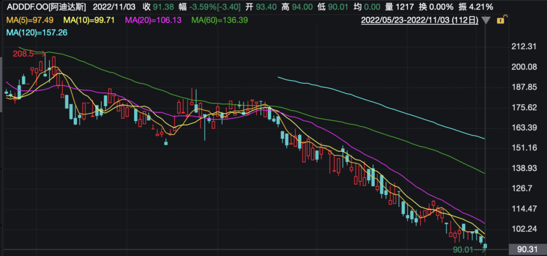 2022年10月,阿迪達(dá)斯宣布徹底結(jié)束與Kanye West(侃爺)長達(dá)9年的的合作,旗下曾經(jīng)最熱門的YEEZY系列也隨之停止生產(chǎn),這次合作的終止也使阿迪達(dá)斯產(chǎn)生了大量的庫存堆積,造成了約6億歐元的庫存損失,2022年11月3日阿迪達(dá)斯股價(jià)跌至90歐元。