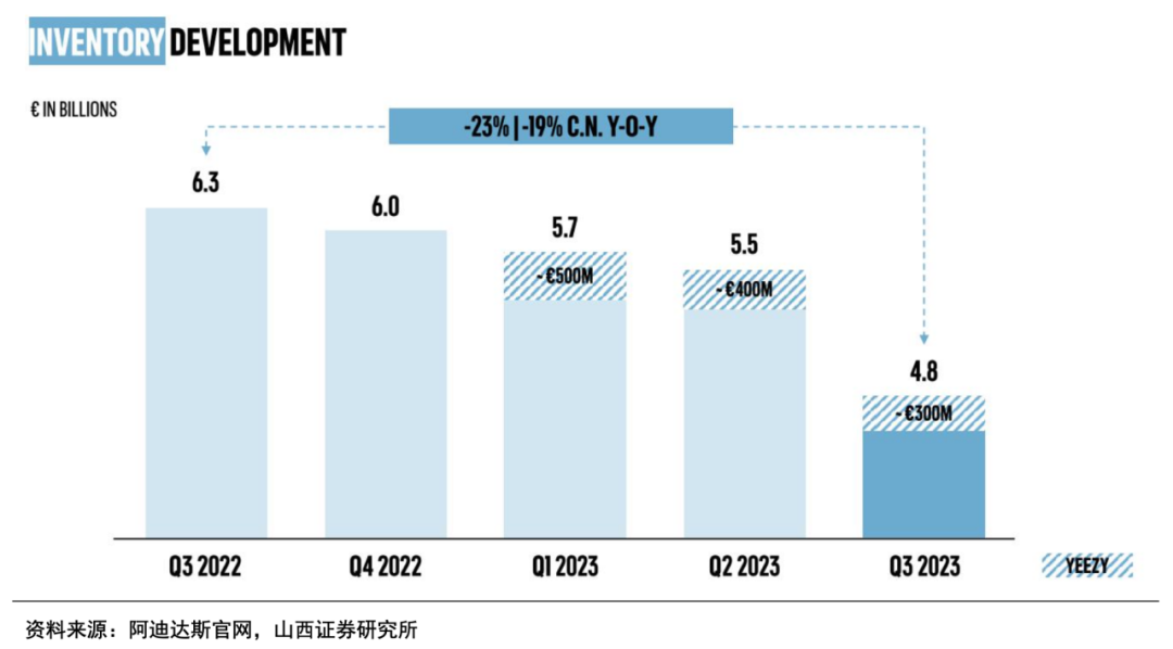2023年6月,YEEZY系列被重新上架,誘發(fā)了消費(fèi)者“買絕版”的心理。首批上架的YEEZY系列為阿迪達(dá)斯帶來了約4億歐元的收入,與2022年同期的銷售額基本持平。根據(jù)2023年三季度報(bào)顯示,截至9月份,阿迪達(dá)斯的庫存水平下降了超過11億歐元,與2022年的63.15億歐元相比下降了23%。