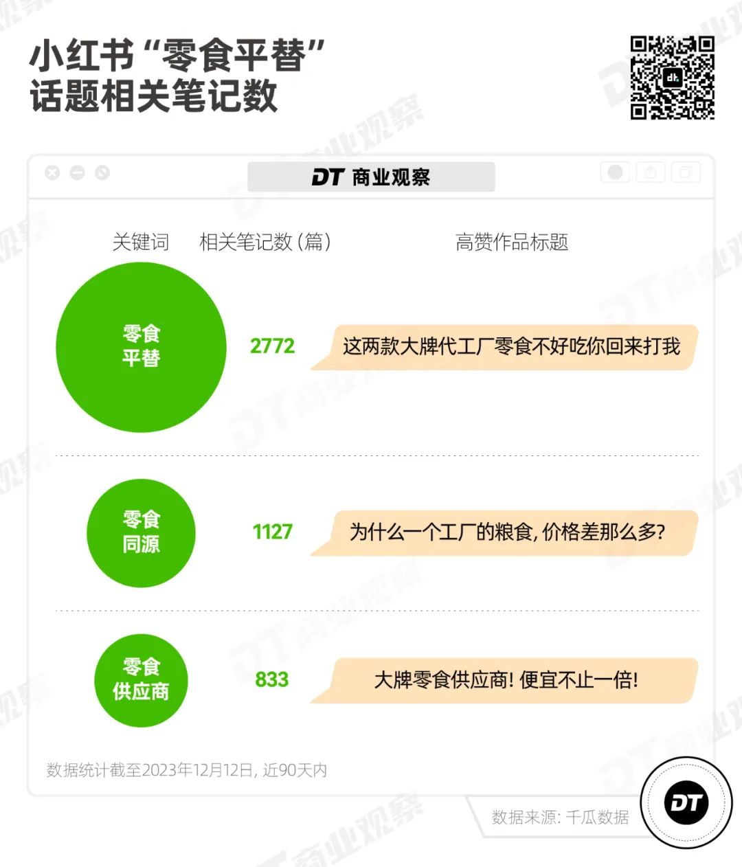 在小紅書上,近90天內(nèi)“零食平替”“零食同源”“零食供應(yīng)商”相關(guān)筆記數(shù)超過4500條。
