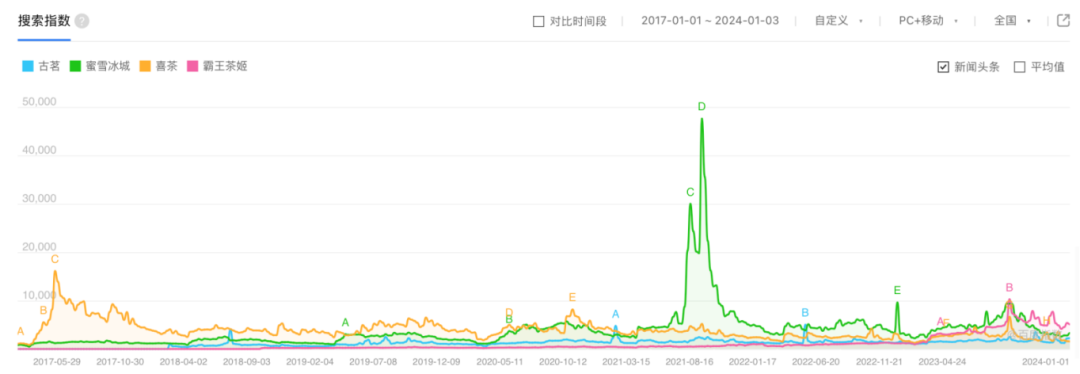 為了進一步求證這一情況,伯虎財經在百度指數(shù)上進行了多番對比。自2017年以來,對比古茗、蜜雪冰城、喜茶、霸王茶姬的搜索指數(shù),古茗整體“墊底”,與蜜雪冰城保持著較大的熱度差距,更是被2023年走紅的霸王茶姬“遙遙領先”。