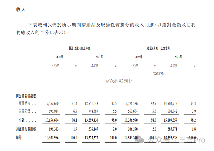 但從數(shù)據(jù)來看,在2021年、2022年全年,以及2022年和2023年的前九個月,來自商品銷售的收入占比都超過了90%;而來自設備銷售的占比,最高才6.7%。