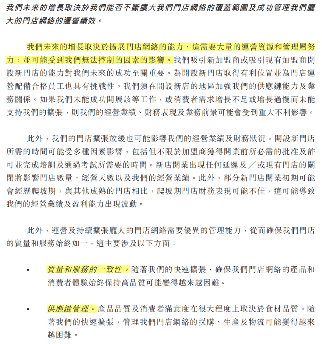 最新招股書(shū)則將“加盟門(mén)店監(jiān)管風(fēng)險(xiǎn)”美化為:我們未來(lái)的增長(zhǎng)取決于我們能否不斷擴(kuò)大我們門(mén)店網(wǎng)絡(luò)的覆蓋范圍及成功管理我們龐大的門(mén)店網(wǎng)絡(luò)的運(yùn)營(yíng)績(jī)效。