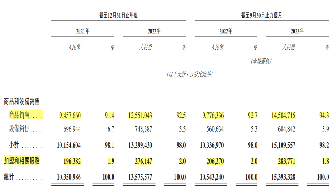 招股書(shū)顯示,2023年前9個(gè)月,蜜雪冰城154億元營(yíng)收中,來(lái)自商品銷(xiāo)售的收入達(dá)145億元,占比94.3%。