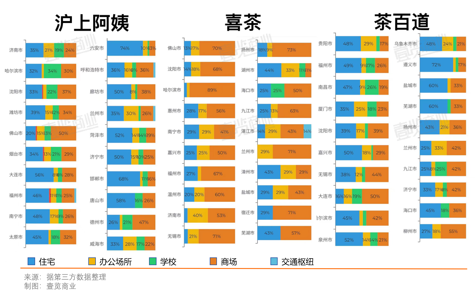 在部分非一線城市,壹覽商業(yè)也將喜茶與茶百道、滬上阿姨的門店具體分布進行橫向?qū)Ρ劝l(fā)現(xiàn),在非一線城市,喜茶的品牌優(yōu)勢能幫助其獲得各地優(yōu)質(zhì)商圈的點位,可以重抓商場店,搶占市場高地。