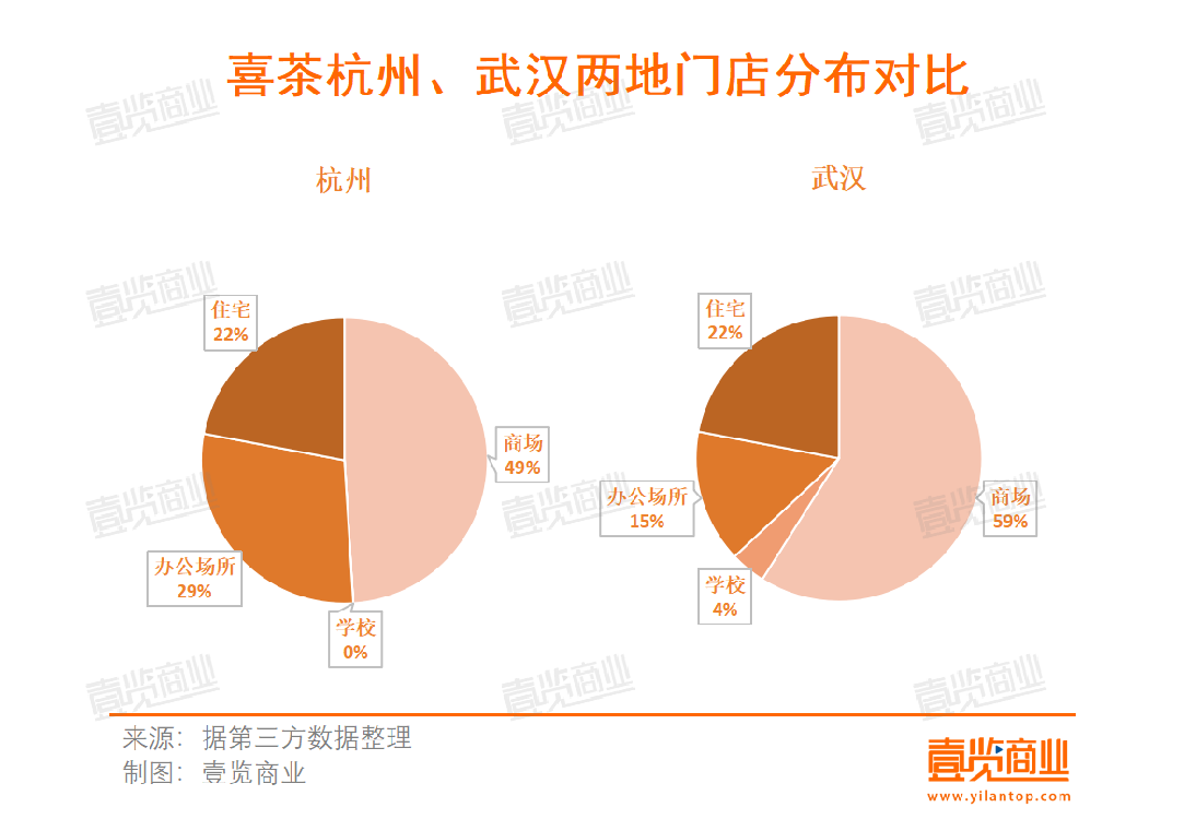其次,喜茶的擴店邏輯非常理性。在各類城市,喜茶基本已占據(jù)所在地的優(yōu)質(zhì)商圈,除了核心商圈外,在學(xué)校、社區(qū)、交通樞紐等多元化場景的門店拓展也在積極的進行;另一方面,具體到不同城市,喜茶的選址也是有差異的。例如,同是新一線城市,喜茶在“電商之都”杭州會更加聚焦住宅區(qū)、辦公場所和購物場所。而在有最大規(guī)模大學(xué)城的武漢,辦公場所門店分布較其他地區(qū)偏少,學(xué)校聚集地則更多。