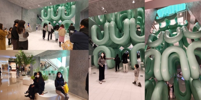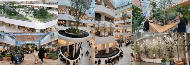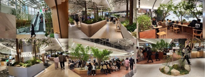 特別是在1樓設置了現(xiàn)有百貨商店中看不到的12米高的人工瀑布的"Water fall Garden/瀑布花園(740㎡)",5樓在20m層高處的天然草坪上建有樹木和多樣的花朵,計劃建設面積約3300㎡的室內綠色公園"Sounds Forest",賣場各處共裝飾了1.124萬㎡規(guī)模的室內造景空間,讓人產生仿佛不是百貨而是在主題公園或野外公園的幻想感已經達成了韓國最出名的網紅打卡點其中一個。