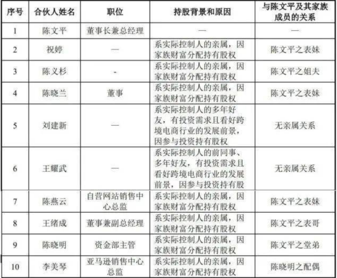 據(jù)公開信息,公司實際控制人陳文平及其家族成員共11人,包括胞兄陳文輝、表妹陳曉蘭、陳燕云、祝婷,堂弟陳曉明,表哥王緒成等,在11名董事會成員中,陳文平家族成員獲4席。表妹陳燕云擔(dān)任自營網(wǎng)站銷售中心總監(jiān),堂弟陳曉明及其妻子李美琴分別擔(dān)任公司資金部主管和亞馬遜銷售中心總監(jiān)……截至目前,陳文平合計持有賽維時代49.06%的股權(quán),陳文平家族合計持股比例則達到了80.13%。