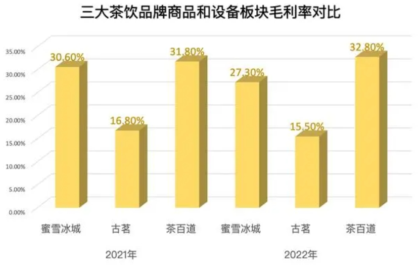 不過,雖然蜜雪冰城建成了行業(yè)最成熟的供應(yīng)鏈,但是相比起茶百道,其并無太大的成本優(yōu)勢(shì)。2021年-2022年,蜜雪冰城在商品和設(shè)備銷售方面的毛利率分別為30.6%、27.3%,同期茶百道為32.8%、31.8%,古茗則相對(duì)較低,同期為16.8%、15.5%。