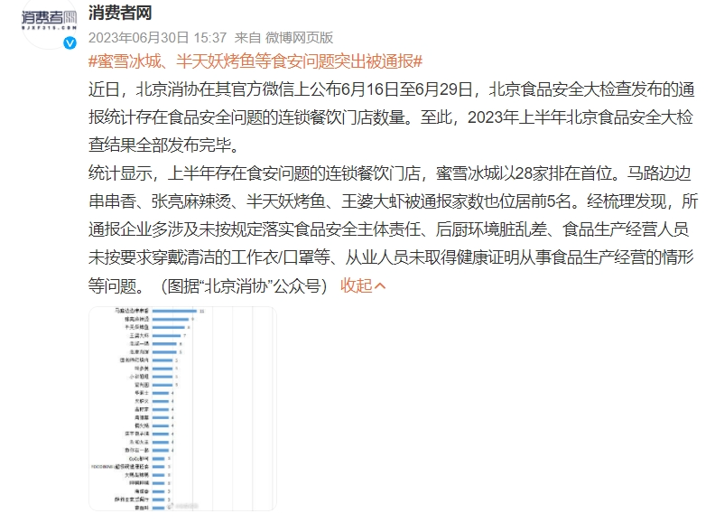 “趣解商業(yè)”在黑貓投訴平臺(tái)搜索“蜜雪冰城”關(guān)鍵詞,發(fā)現(xiàn)有超6800條相關(guān)投訴,其中多數(shù)投訴涉及產(chǎn)品標(biāo)準(zhǔn)化問題及商家服務(wù)態(tài)度問題,還有部分投訴表示在飲品中發(fā)現(xiàn)異物;根據(jù)北京市消費(fèi)者協(xié)會(huì)發(fā)布的消息,2023年上半年在北京食品安全大檢查中,上半年存在食品安全問題的連鎖餐飲門店,蜜雪冰城以28家排在首位。面對(duì)食品安全問題,蜜雪冰城也在招股書中披露了該項(xiàng)風(fēng)險(xiǎn)點(diǎn)。