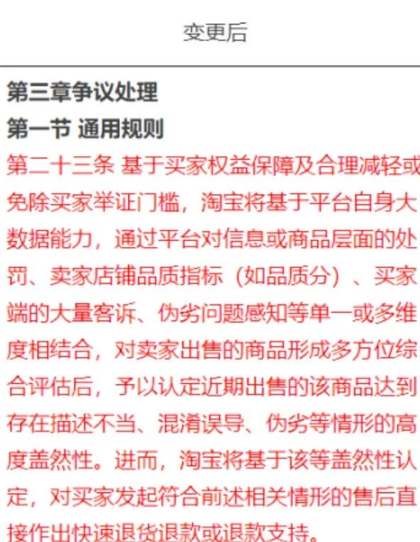 2023年12月25日,淘寶變更了《淘寶平臺(tái)爭(zhēng)議處理規(guī)則》的公示通知,其中最為關(guān)鍵的修改是“新增淘寶基于平臺(tái)自身大數(shù)據(jù)能力,識(shí)別多維度結(jié)合,對(duì)于買家發(fā)起符合相關(guān)情形的售后,做出快速退款或退貨退款的規(guī)則依據(jù)!