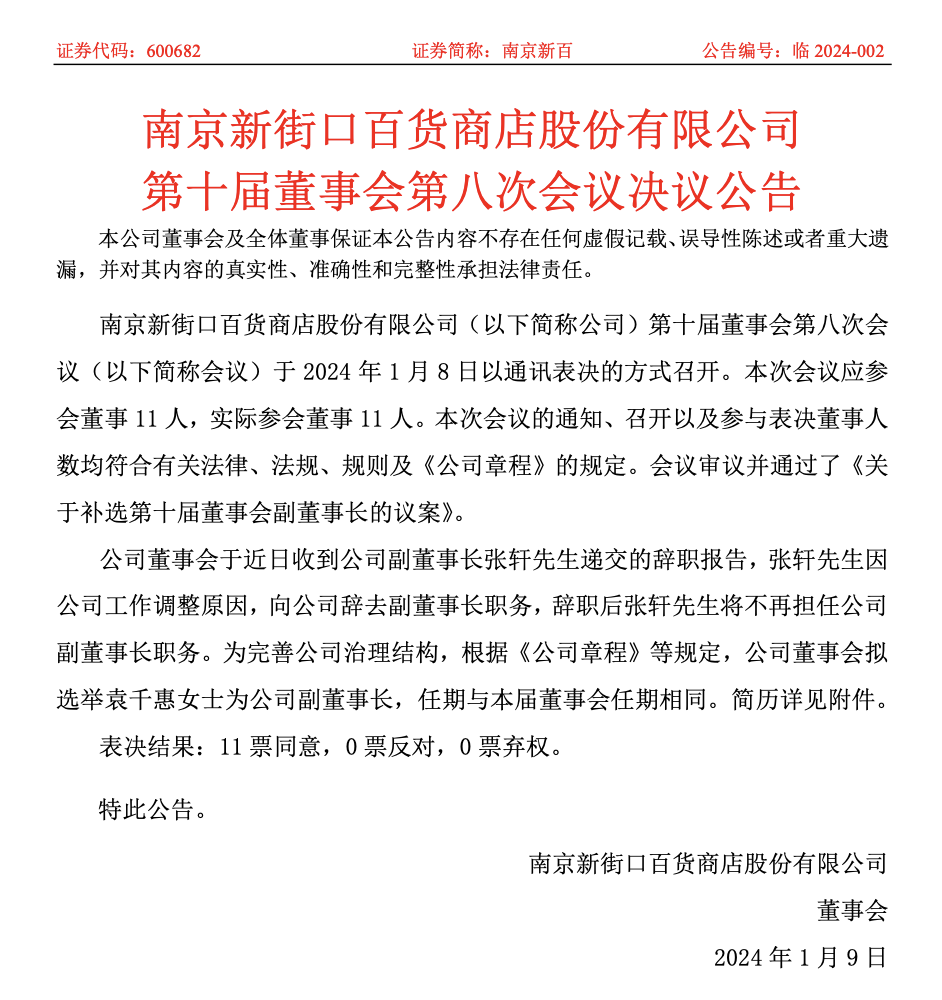 聯(lián)商快訊:1月8日,南京新百發(fā)布第十屆董事會(huì)第八次會(huì)議決議報(bào)告,宣布近日收到公司副董事長(zhǎng)張軒先生遞交的辭職報(bào)告,張軒先生因公司工作調(diào)整原因,向公司辭去副董事長(zhǎng)職務(wù),辭職后將不再擔(dān)任公司副董事長(zhǎng)職務(wù)。