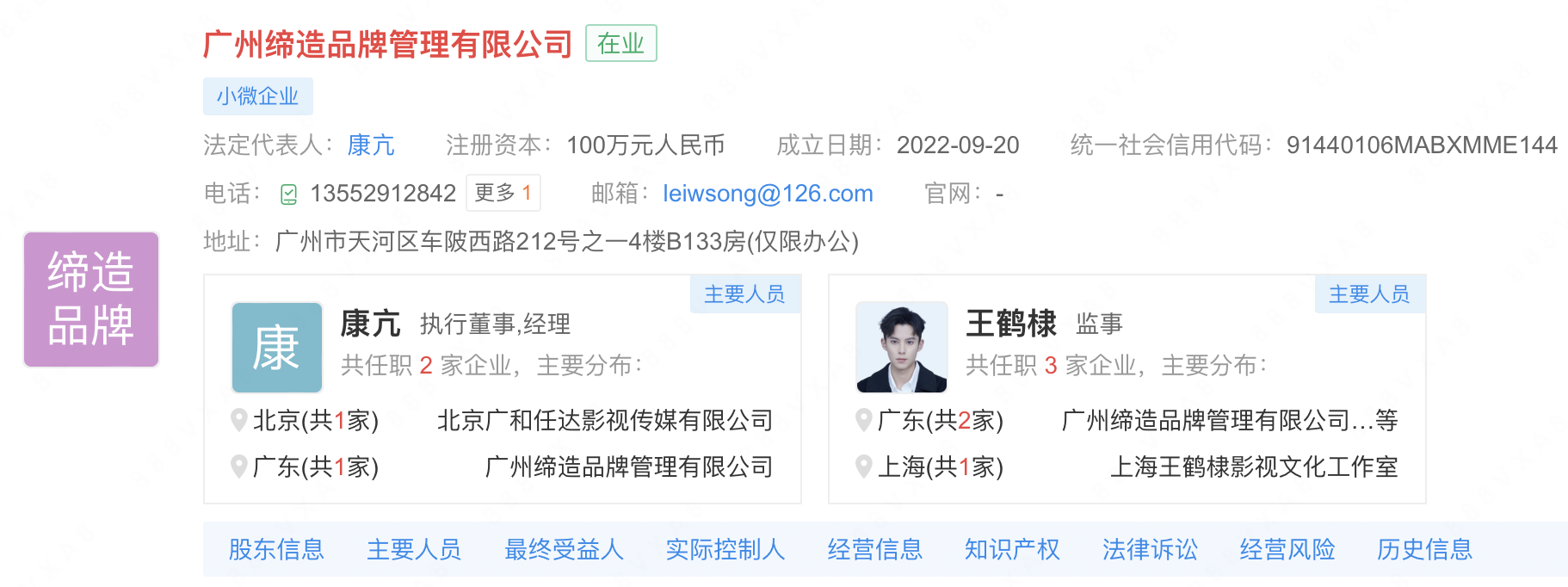 企查查APP顯示,廣州締造品牌管理有限公司成立于2022年9月,法定代表人為康亢,注冊(cè)資本100萬(wàn)人民幣,由王鶴棣持股51%并擔(dān)任監(jiān)事。