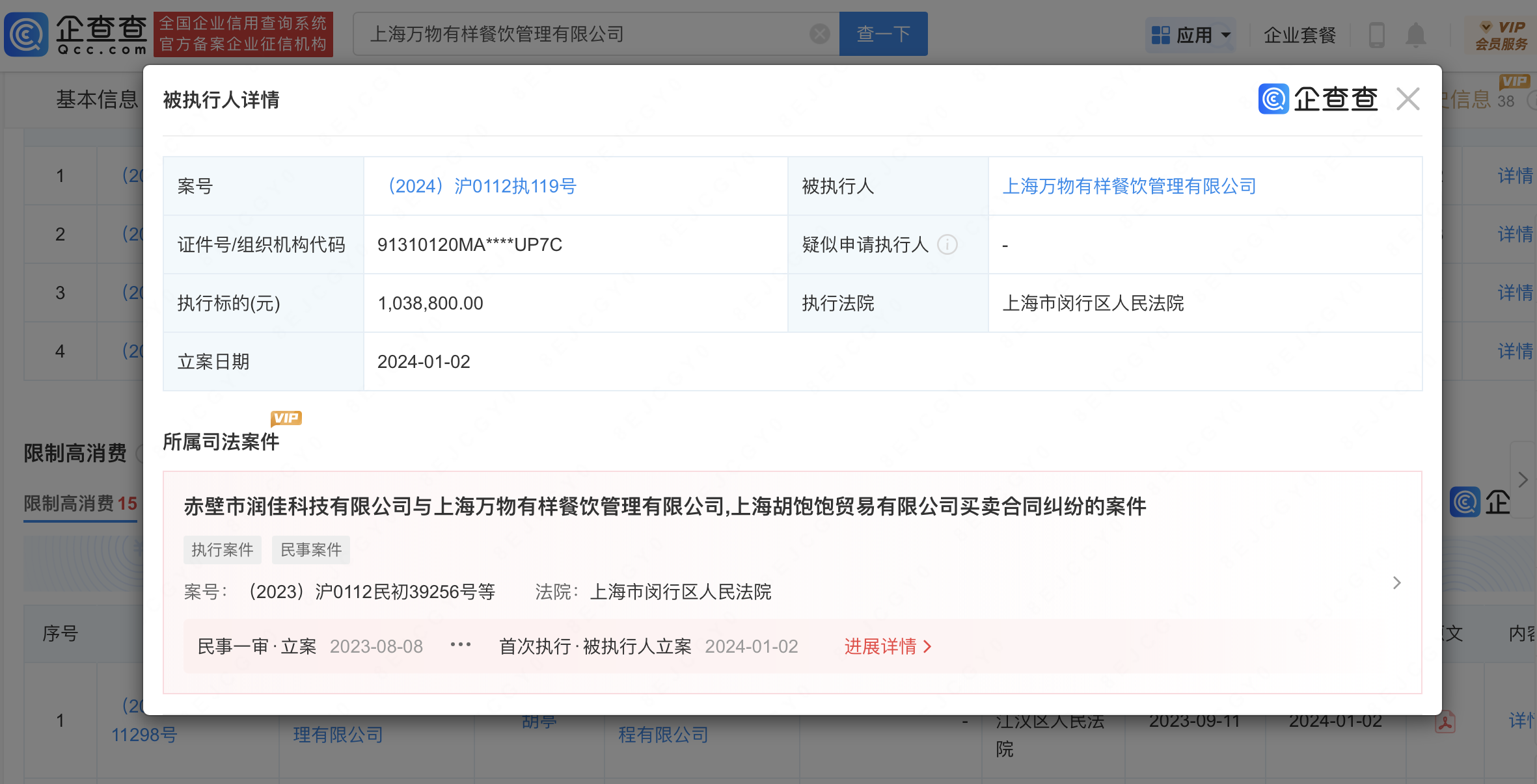 聯(lián)商快訊:近日,企查查信息顯示,新中式糕點品牌虎頭局渣打餅行母公司上海萬物有樣餐飲管理有限公司及其子公司上海胡飽飽貿(mào)易有限公司,新增一則被執(zhí)行人信息,執(zhí)行標(biāo)的103.88萬元,涉及買賣合同糾紛案件,執(zhí)行法院為上海市閔行區(qū)人民法院。
