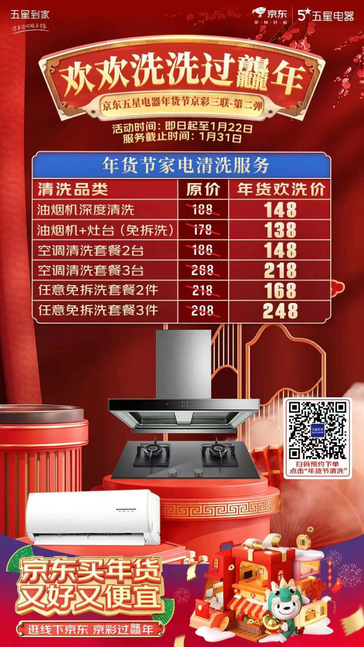 春節(jié)將至,每逢年終歲尾,本地生活服務(wù)市場(chǎng)進(jìn)入傳統(tǒng)消費(fèi)旺季,許多市民把“年終大掃除”作為迎接新年的儀式感,往往會(huì)提前預(yù)約保潔清洗服務(wù)。為迎合市場(chǎng)需求,即日起至1月22日,京東五星電器推出“年貨節(jié)家電清洗服務(wù)”特惠價(jià):原價(jià)188元的油煙機(jī)深度清洗148元;原價(jià)186元空調(diào)清洗套餐2臺(tái)優(yōu)惠價(jià)148元;原價(jià)298元任意免拆洗套餐3件活動(dòng)價(jià)248元……讓家電“洗澡”過大年。