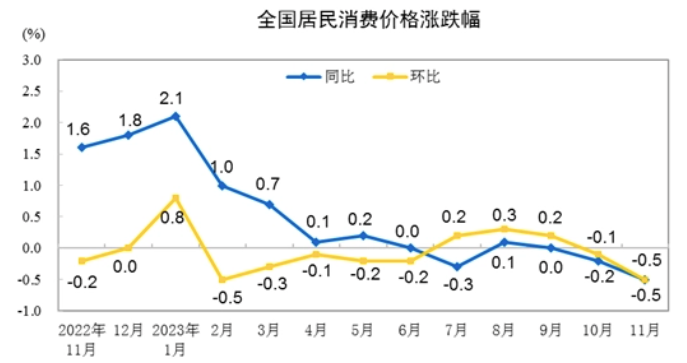 由2023年全年CPI走勢可發(fā)現(xiàn):整體呈前高后低且不斷走低態(tài)勢,10、11月份同環(huán)比更是連續(xù)出現(xiàn)負增長且降幅愈發(fā)擴大。這反映出消費不振、供需進一步失衡,需求端愈發(fā)萎靡等突出問題。