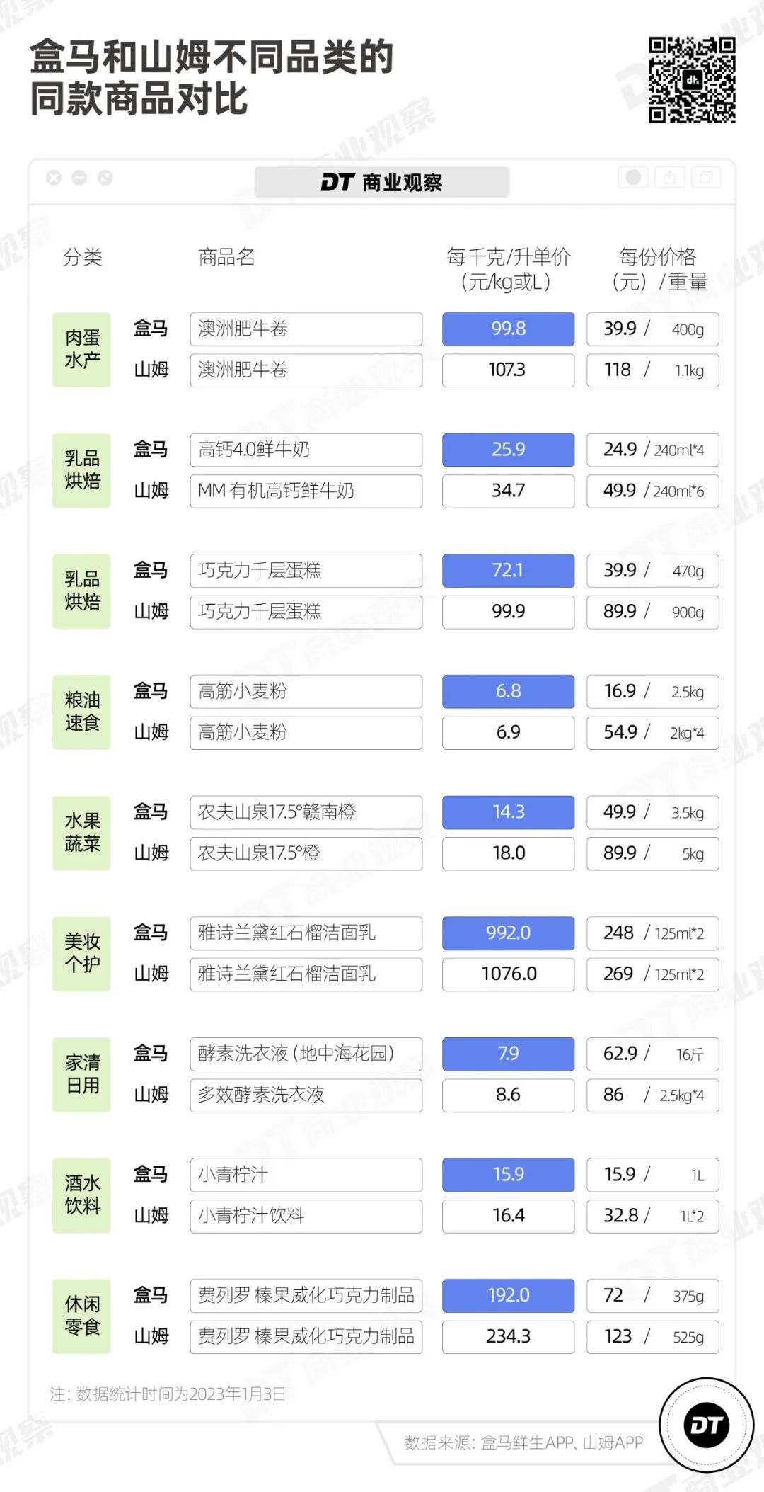 《DT商業(yè)觀察》對比了奧樂齊超值系列的71款商品、盒馬“移山”156款商品,并把山姆的同款或相似的商品作為對照,有如下發(fā)現(xiàn),并在每一點(diǎn)發(fā)現(xiàn)下面,做了一些分析。