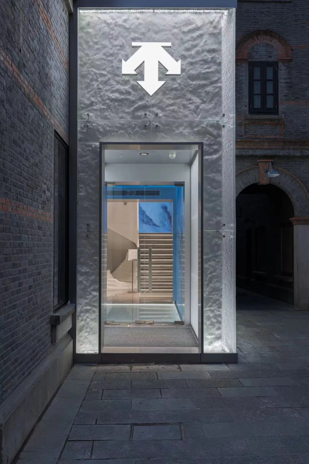 從細(xì)節(jié)處看,迪桑特打破了傳統(tǒng)門店的「直白」動(dòng)線,而是用「環(huán)形雪山雪道」勾勒出穿梭通道,供顧客在灰磚、冰塊、雪道與電子冰柱之間穿梭,在挑高兩層的空間中完成一場(chǎng)穿越之旅。