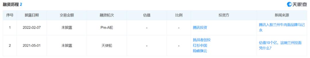 根據(jù)天眼查數(shù)據(jù)顯示,三大新一代蘭州拉面品牌們上一次融資還是騰訊在2022年2月7日入股馬記永,陳香貴和張拉拉的融資記錄都停留在了2021年底。2023年上半年,只有兩個(gè)粉面品牌拿到融資。